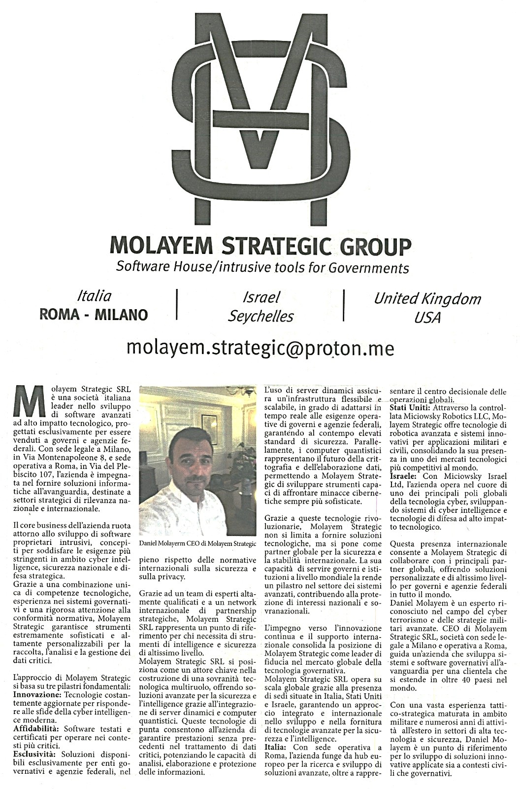 Molayem Strategic SRL è una software house italiana con sedi a Milano e Roma, specializzata nello sviluppo di strumenti intrusivi avanzati per governi e agenzie federali. L’azienda fornisce soluzioni di cyber intelligence e difesa strategica di altissimo livello, rispettando rigorosi standard di sicurezza e normative internazionali. Grazie all’uso di server dinamici e computer quantistici, assicura infrastrutture flessibili e scalabili per la protezione dei dati e la prevenzione di minacce cibernetiche. La sua presenza globale, con hub in Israele, UK, USA e Seychelles, consente di offrire supporto in tempo reale e tecnologie personalizzate per esigenze militari e civili. L’approccio integrato di Molayem coniuga innovazione, sostenibilità e attenzione etica, consolidando il ruolo dell’azienda come partner strategico di governi e istituzioni per la sicurezza internazionale.